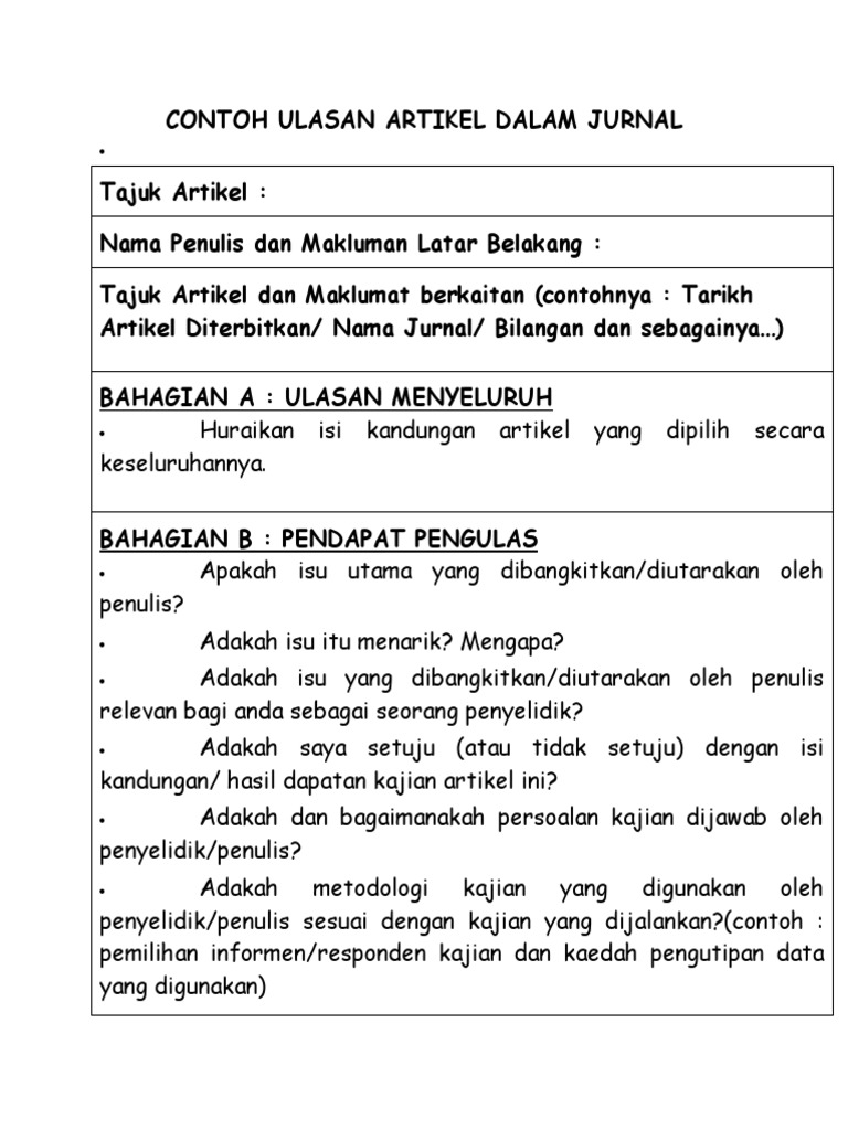 Ulasan menyeluruh huraikan isi kandungan artikel yang dipilih secara keseluruhannya. Izzati rozman & aimee dalila pendahuluan analisis wacana kritis merupakan suatu kaedah pendekatan kritis dalam bidang. Latar belakang artikel ini merupakan hasil kajian yang dijalankan oleh janice t.s. Pertembungan ketamadunan atau pertembungan keagamaan: Contoh ulasan artikel dalam jurnal contoh ulasan artikel ilmiah.